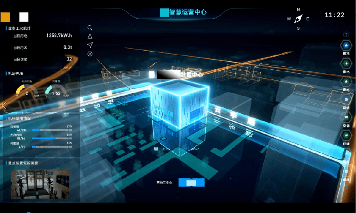 基于客戶現(xiàn)狀及需求,UINO通過應(yīng)用數(shù)字孿生技術(shù)完整呈現(xiàn)數(shù)據(jù)中心的運營狀態(tài),采用3D科技風(fēng)風(fēng)格,從兩地三中心、供配電、動環(huán)、安防、消防、機房IT能力的多方面角度展示該銀行新一代數(shù)據(jù)中心能力。具體實施范圍包括: