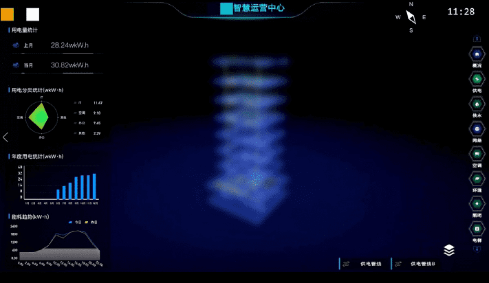 集成供電管理系統(tǒng),在三維場景匯總展示供電設(shè)備的空間分布;通過面板展示IT設(shè)備、照明、空調(diào)、動力、特殊各分項用電的能耗數(shù)據(jù)